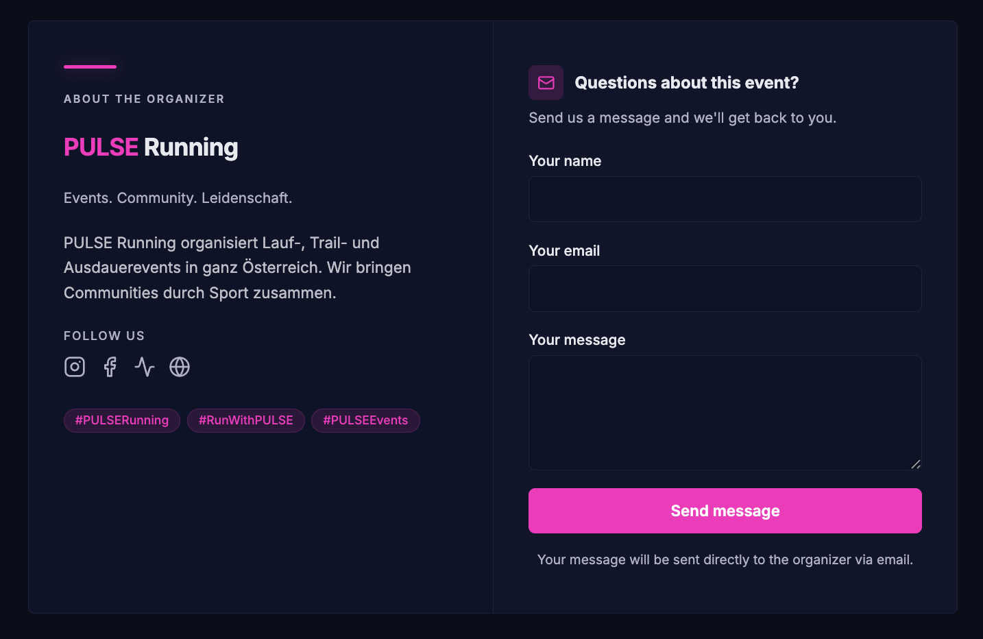 NeuNeue Section für Event + Series Seiten: "Organizer"! In diesem Block werden Organizer Infos angezeigt wie zum Beispiel Links zu euren Social Media Kanälen, Website oder ein Kontaktformular!